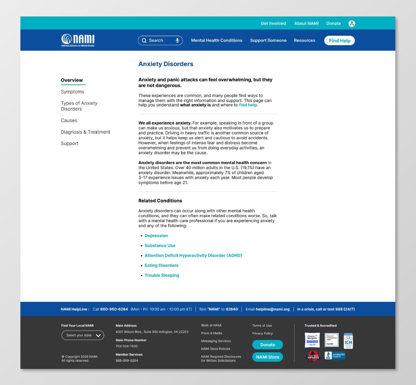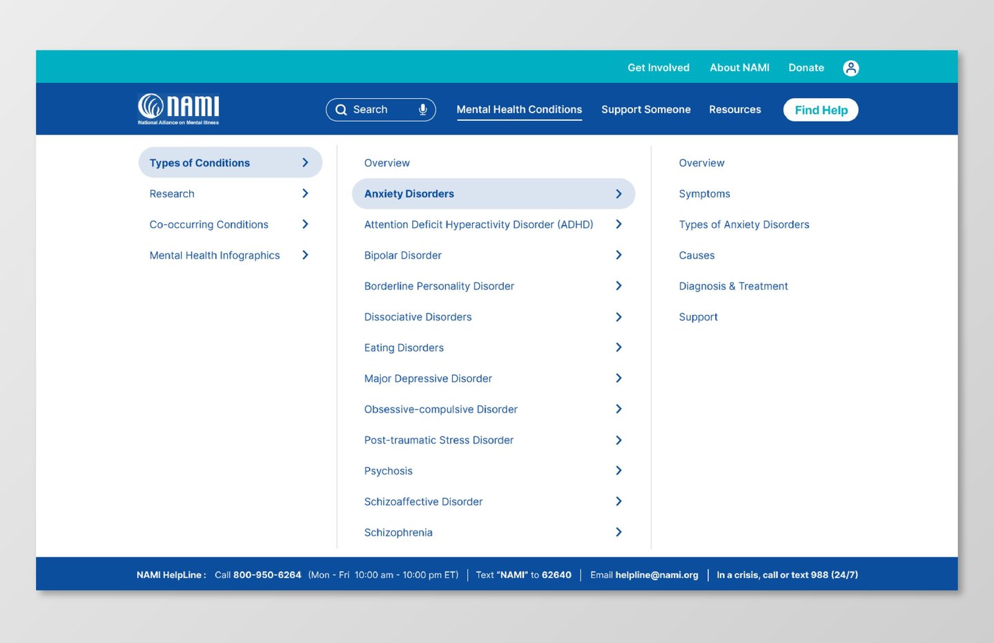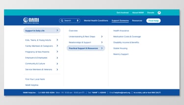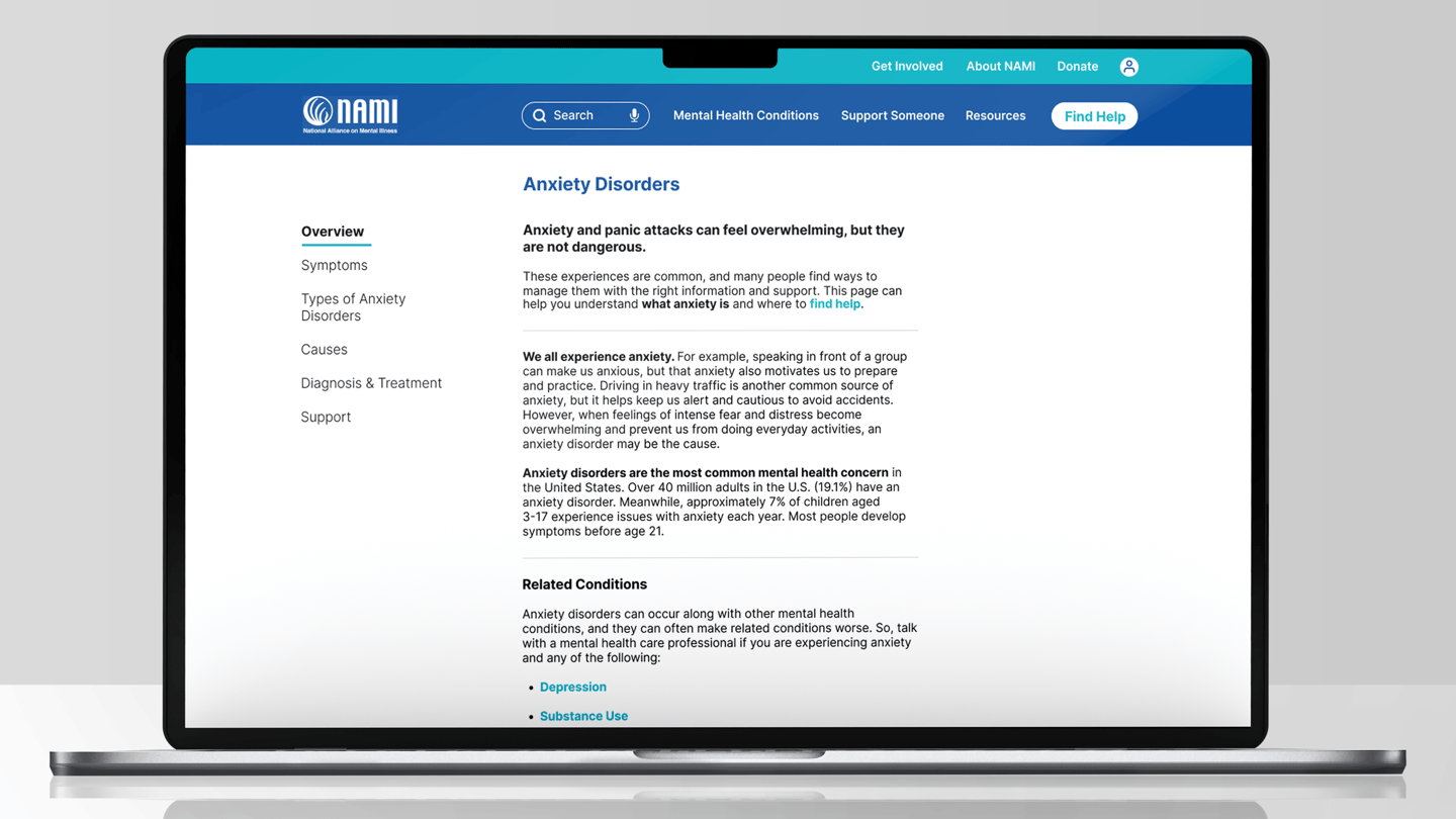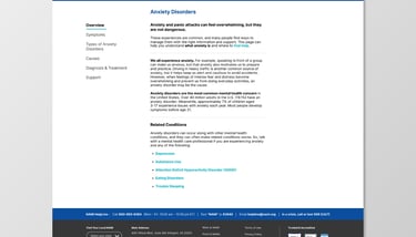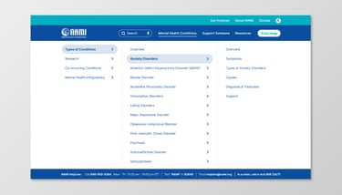 On NAMI.org, the Anxiety Disorders page and navigation include dense text, unclear hierarchy, and overwhelming menu structures.