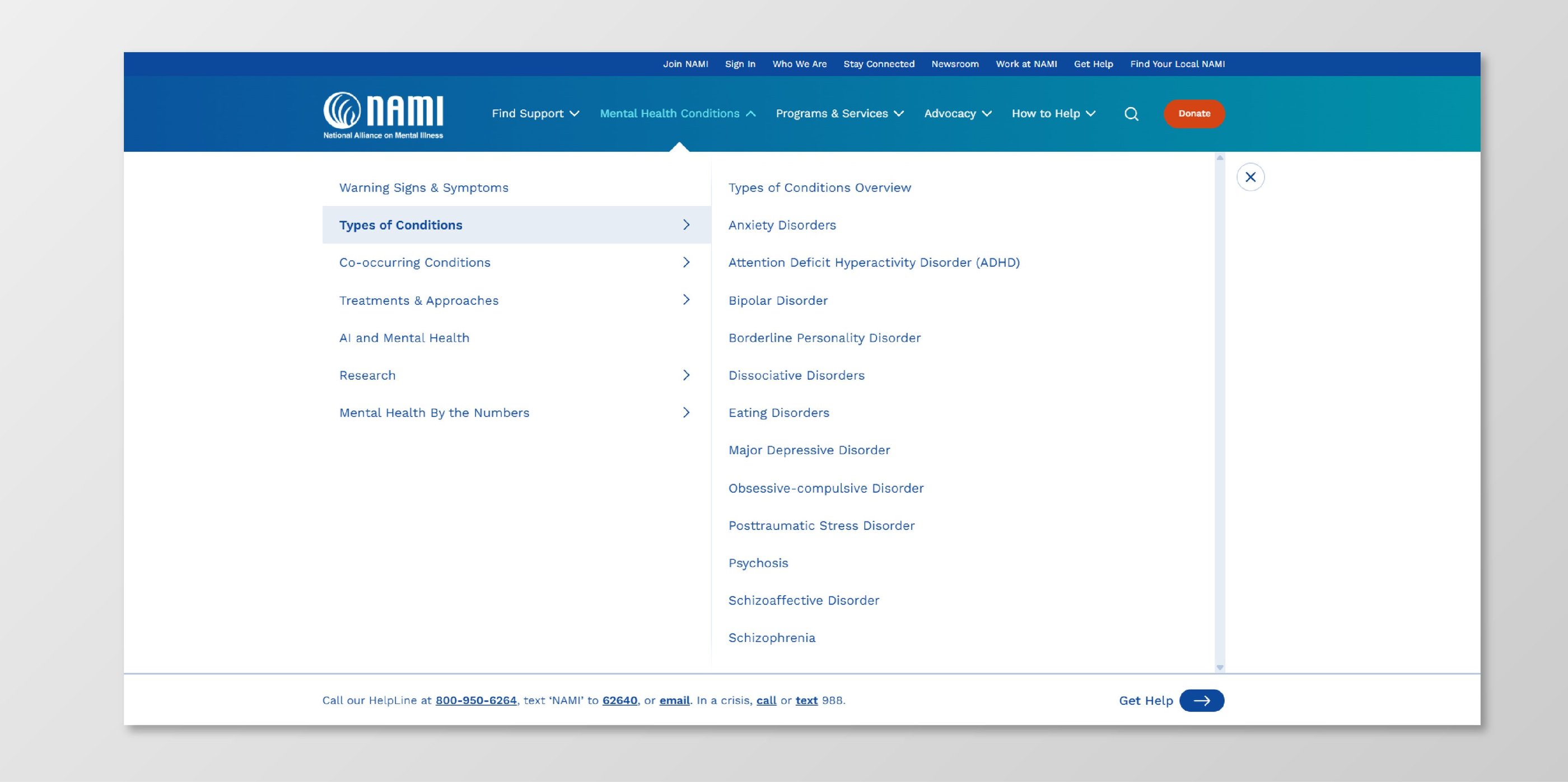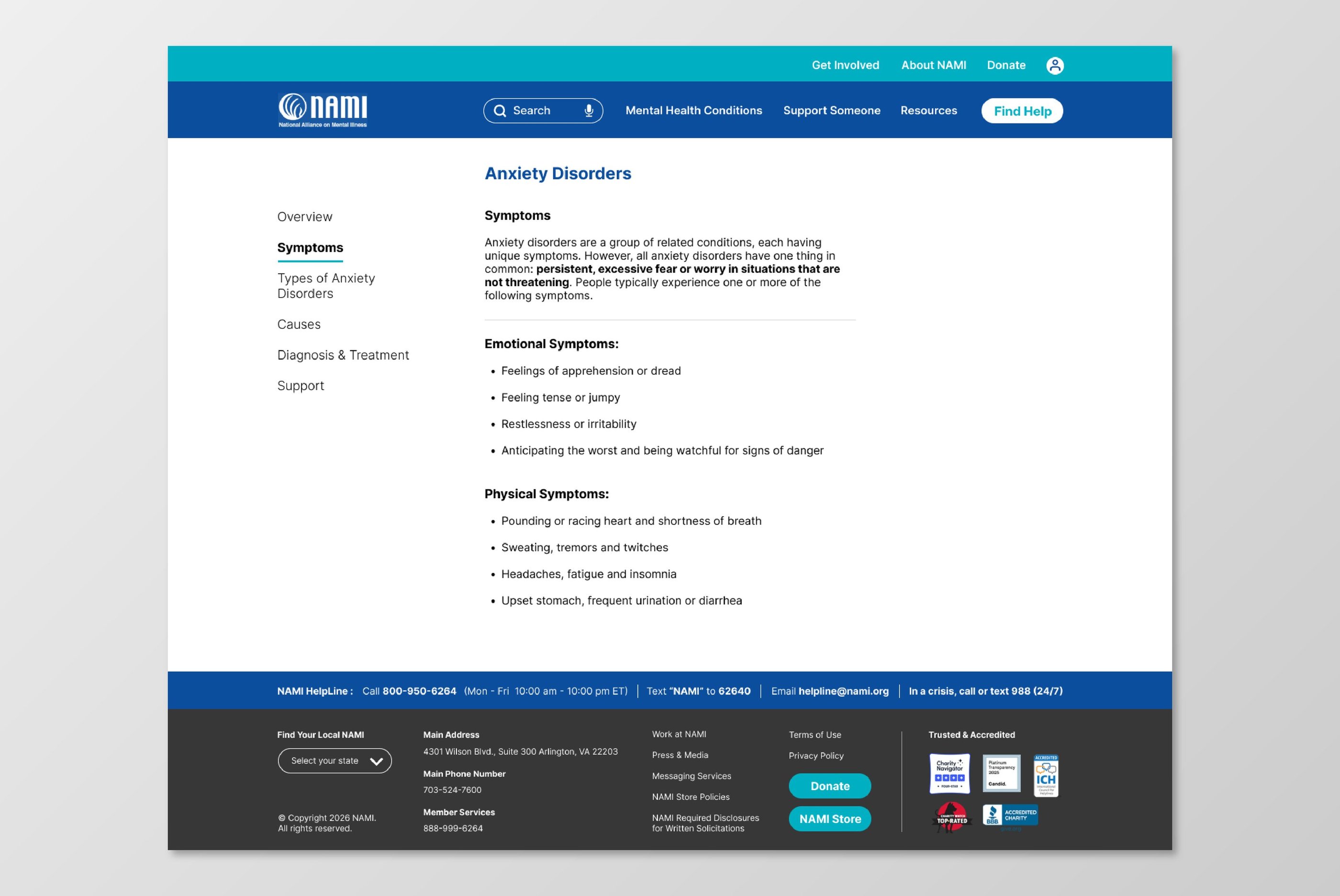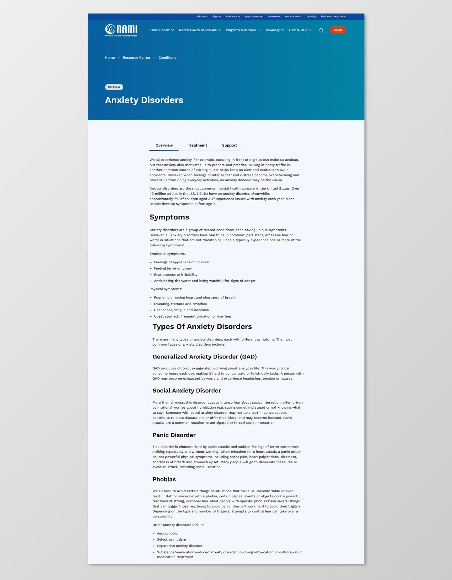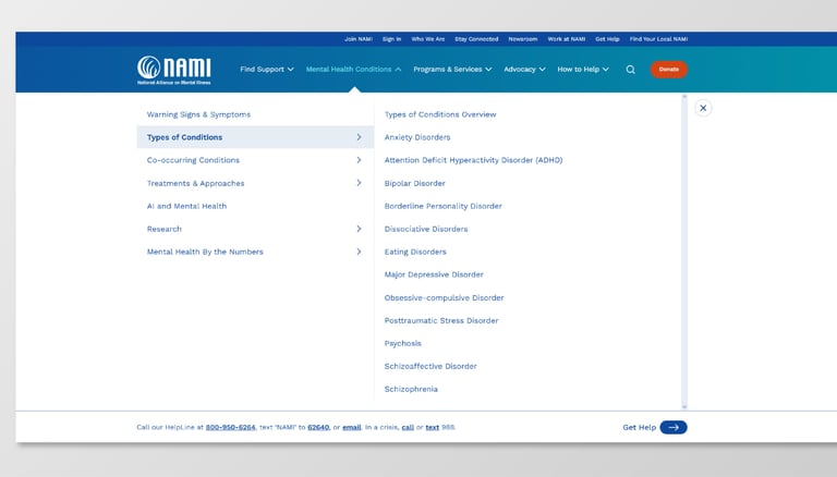 On NAMI.org, the Anxiety Disorders page and navigation include dense text, unclear hierarchy, and overwhelming menu structures.