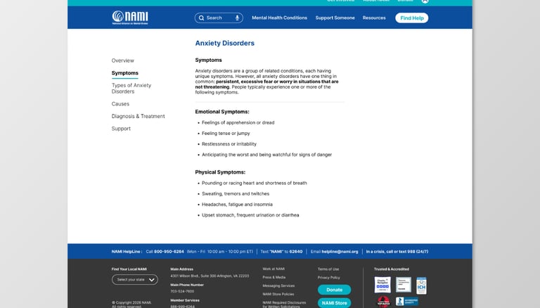 I redesigned the Anxiety Disorders page and navigation with a focus on cognitive accessibility, aiming to make information easier to read, understand, and navigate.